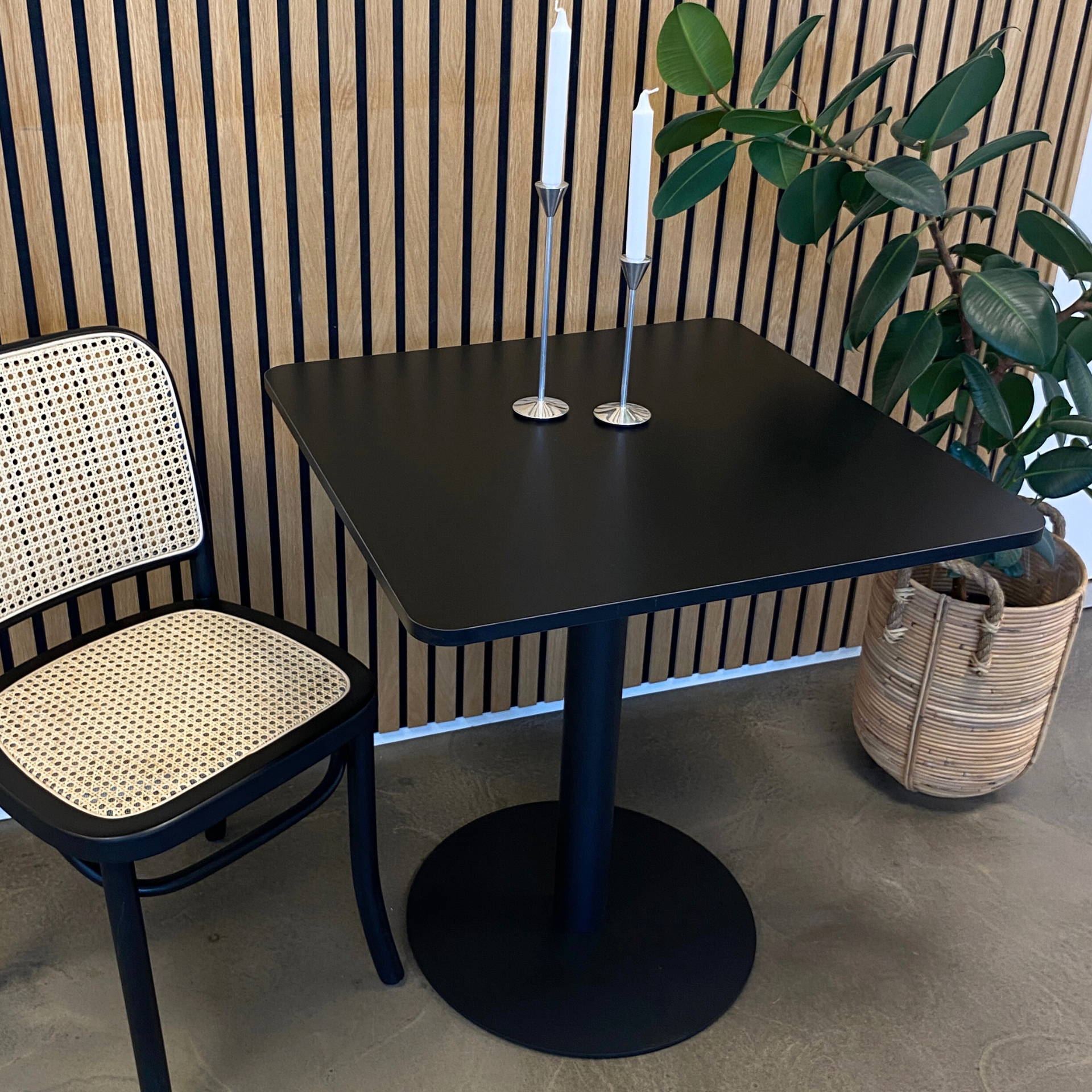 Onze vierkante zwarte cafétafel bestaat uit een zwart tafelblad en zwart gelakte tafelpoten.
