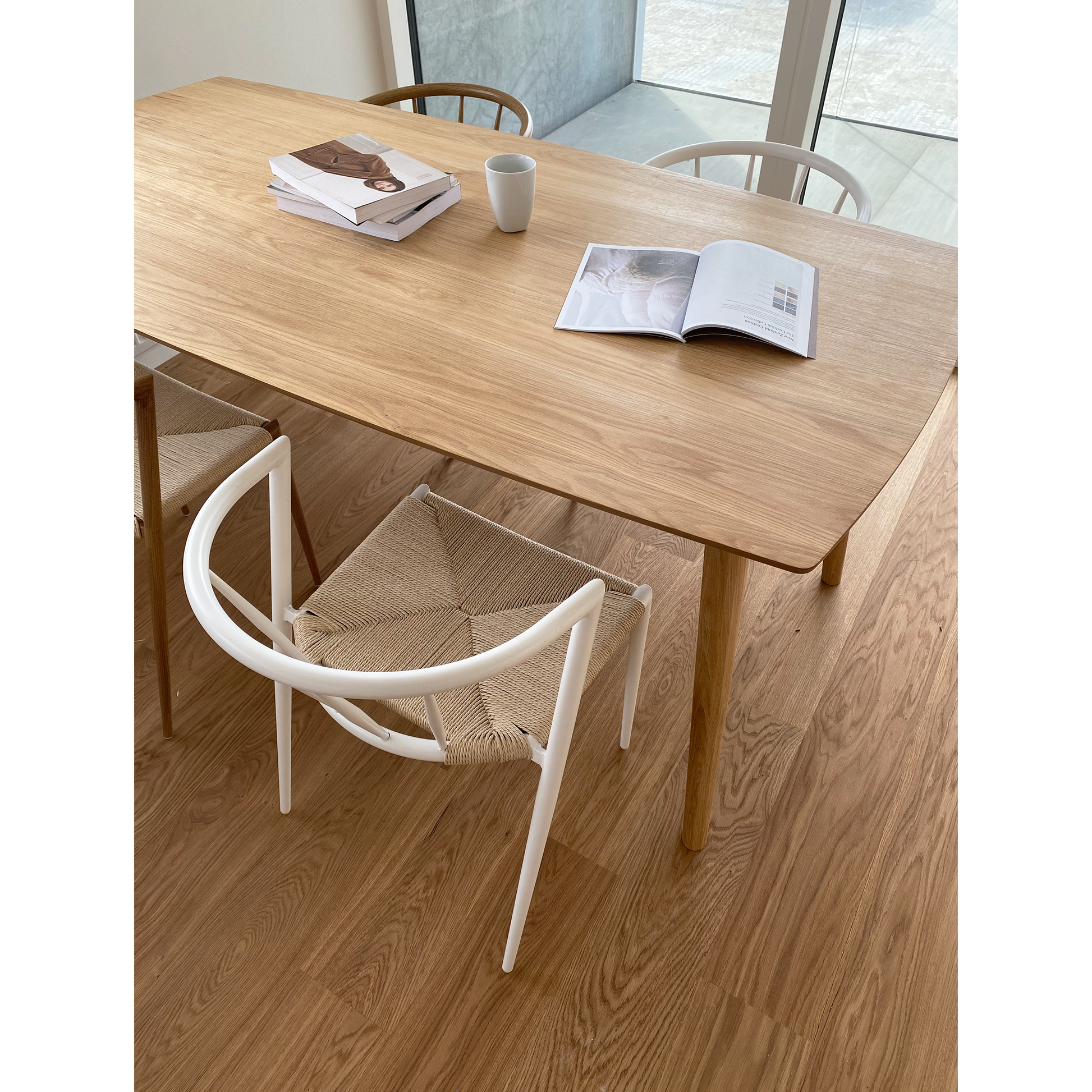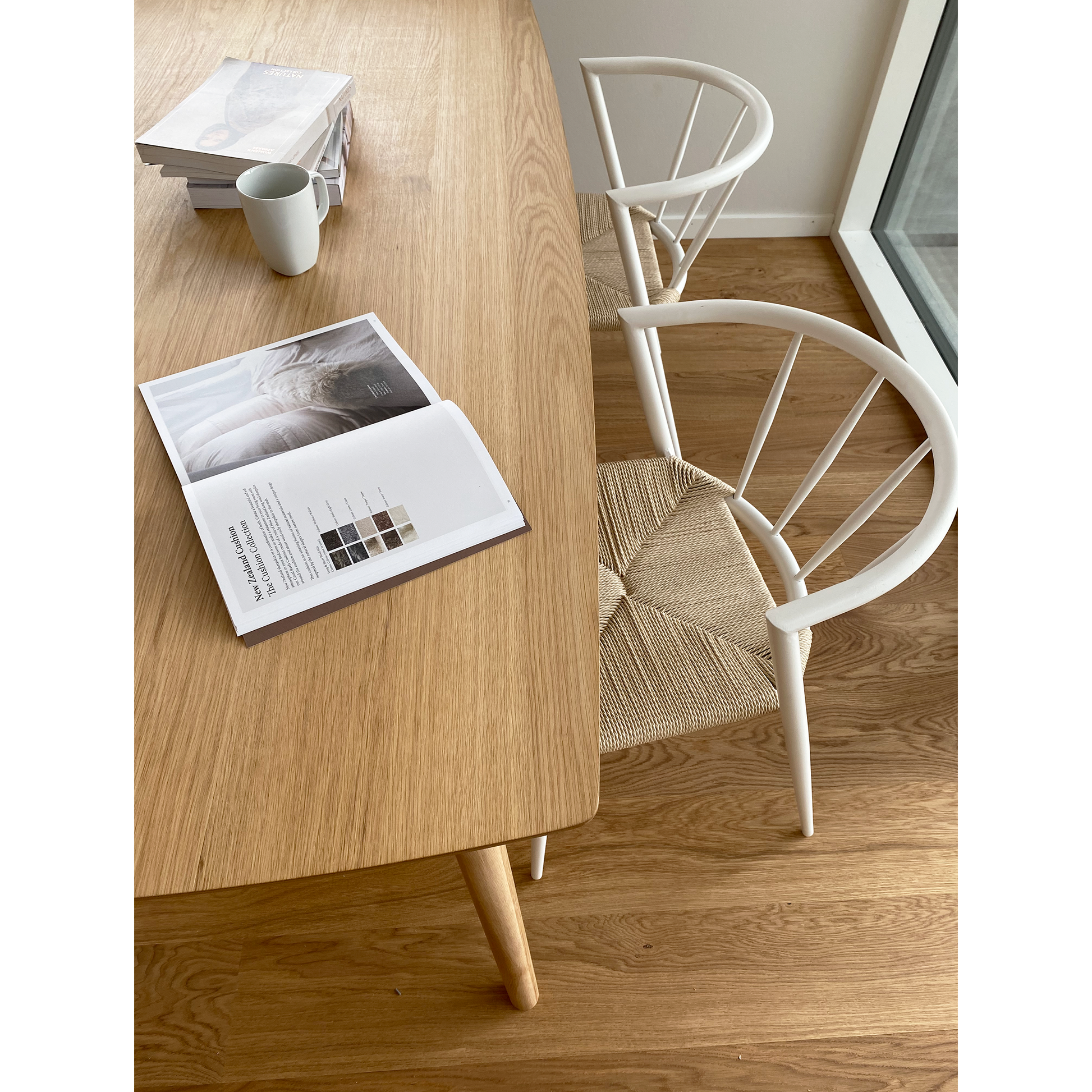 Het klassieke ontwerp van de stoel is rechtstreeks afkomstig uit de Scandinavische stijl en volgt het principe 'Keep it simple'. De vorm van de stoel is eenvoudig maar heeft elegante lijnen, en de lichte gevlochten zitting is duurzaam en stijlvol tegelijk, terwijl de stoel stapelbaar is. Het zitcomfort is ook uitstekend met de afgeronde en kenmerkende rugleuning, maar als je het extra comfortabel wilt maken, kun je een zacht lamsvel toevoegen. Dit zal zeker de gezelligheid en sfeer verhogen en een meer luxe gevoel aan je interieur geven.