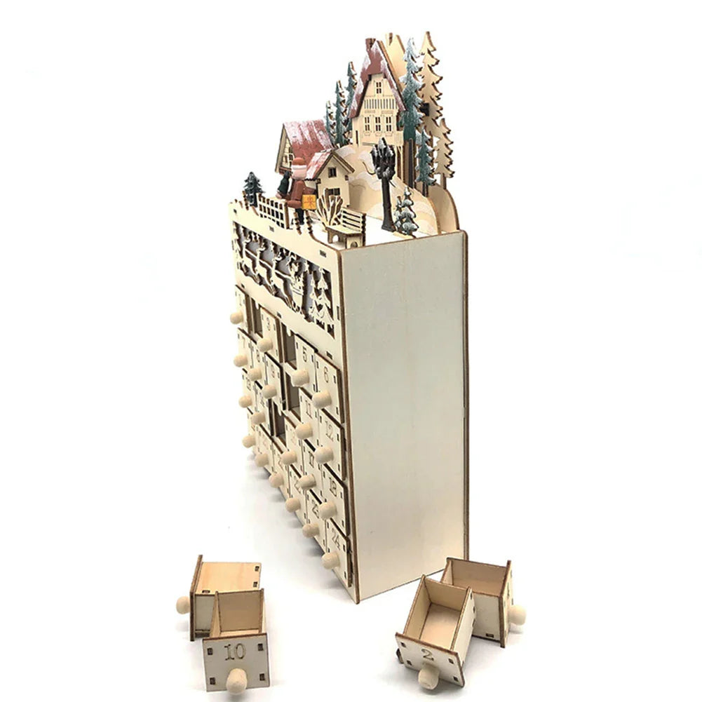 Deze houten adventskalender brengt de warme sfeer van een winterdorp tot leven. Met een decoratief huisje bovenop en subtiele verlichting creëert de kalender een prachtig kerstaccent in elke woonruimte. De 24 vakjes kunnen worden gevuld met kleine verrassingen, decoraties of persoonlijke attenties.