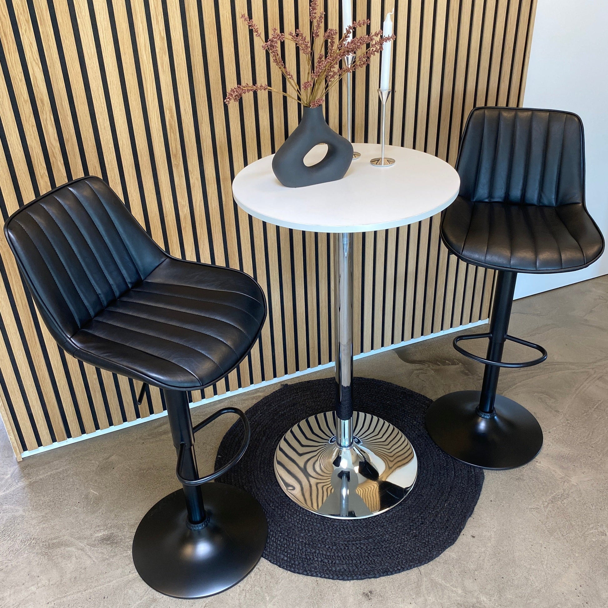 De verstelbare barkruk in zwart kunstleer geeft een moderne en slanke uitstraling, terwijl de draaifunctie gemakkelijke beweging en flexibiliteit mogelijk maakt tijdens het zitten aan de bartafel of keukeneiland, maar ook bij het opstaan en gaan zitten, omdat de stoel 360 graden kan draaien.