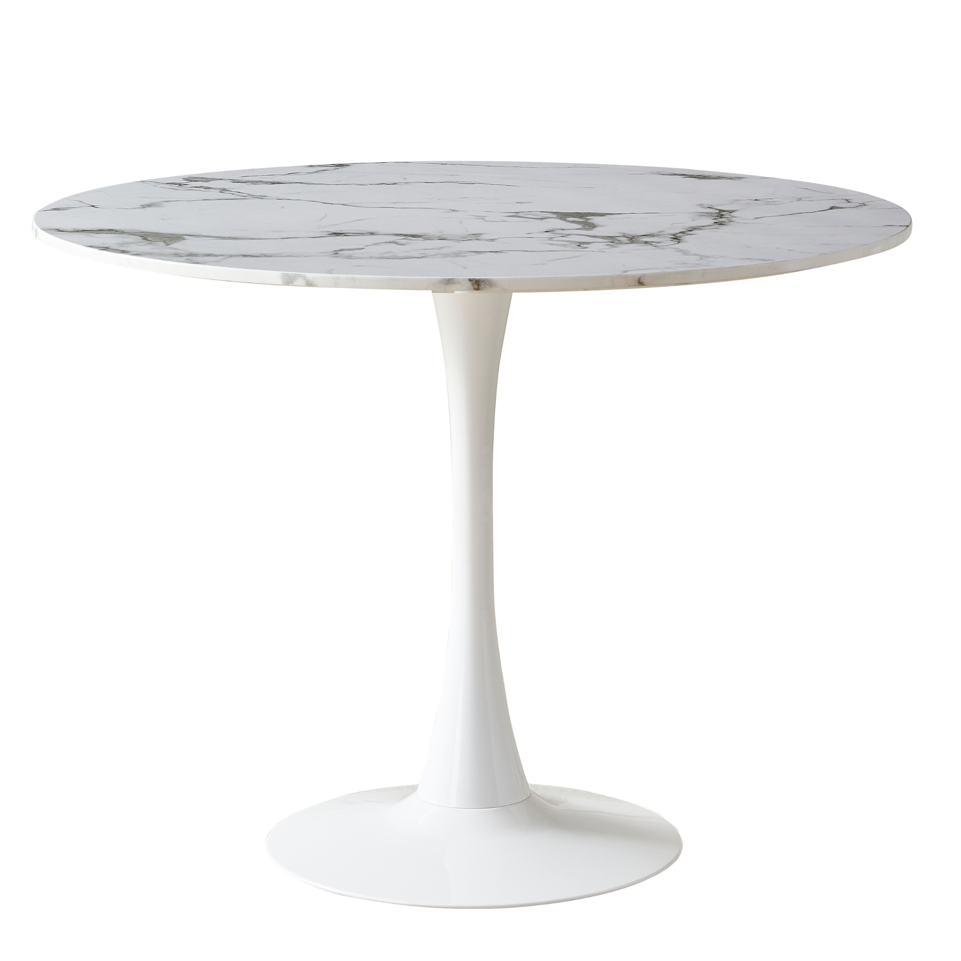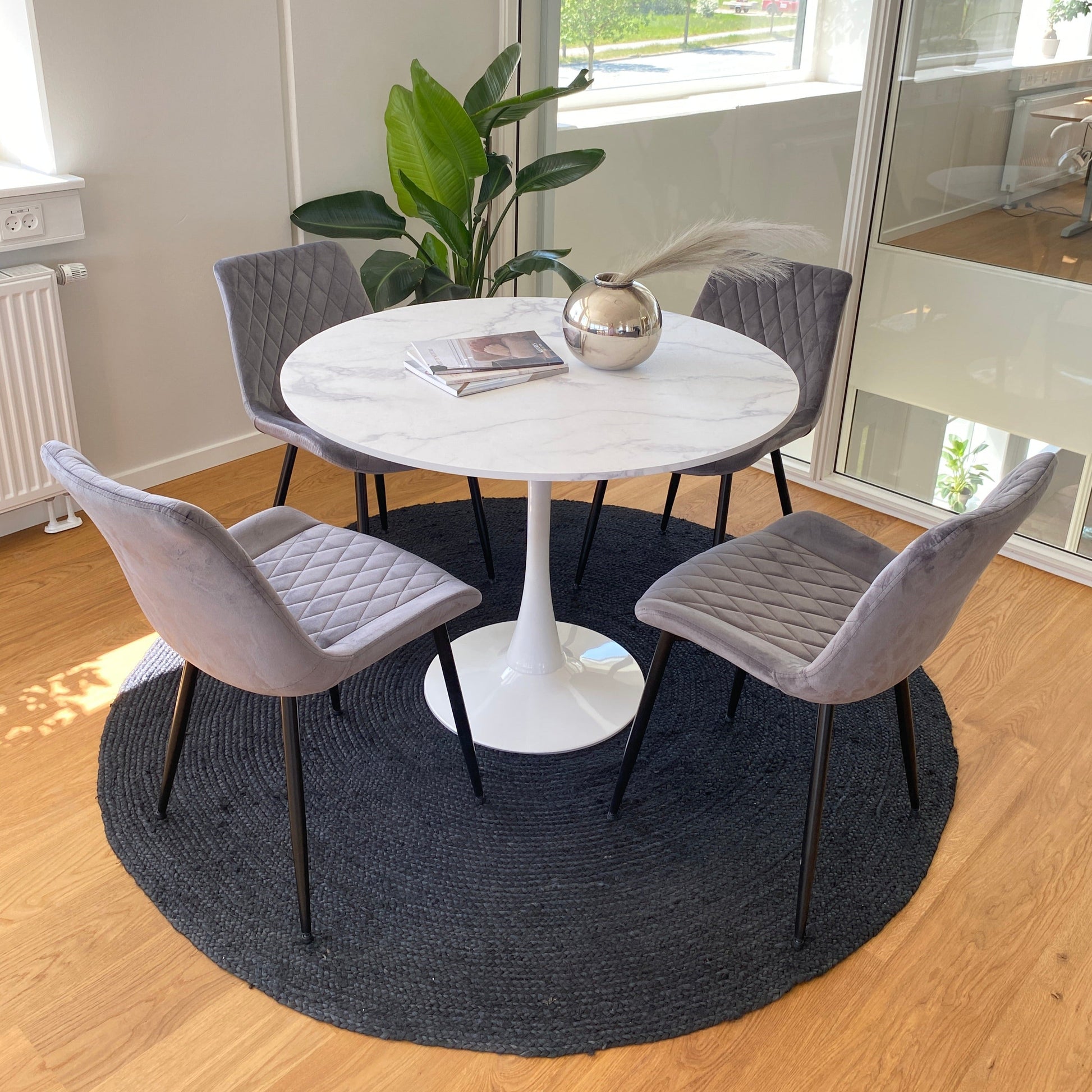 Deze elegante en moderne eettafel is de perfecte keuze voor elk huis dat een vleugje luxe en stijl aan de eetkamer wil toevoegen. De tafel heeft een prachtige witte afwerking met een realistische marmeren uitstraling in mat, wat zorgt voor een verfijnde en luxueuze uitstraling. Of je het nu gebruikt voor dagelijkse maaltijden of speciale gelegenheden, deze eettafel met marmeren uitstraling zal een indrukwekkende toevoeging zijn aan je huis. De ronde eettafel kan 4 van onze eetkamerstoelen herbergen. Het tafelblad heeft een diameter van 100 cm, dus er is ruimte om met familie of vrienden aan tafel te praten. Het tafelblad is gemakkelijk schoon te maken, omdat het is gemaakt van duurzaam materiaal.
